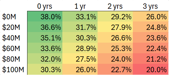 - 1‑year delay (same valuation): Exit in Year 8 → 33% IRR A 5‑point drop just from time.